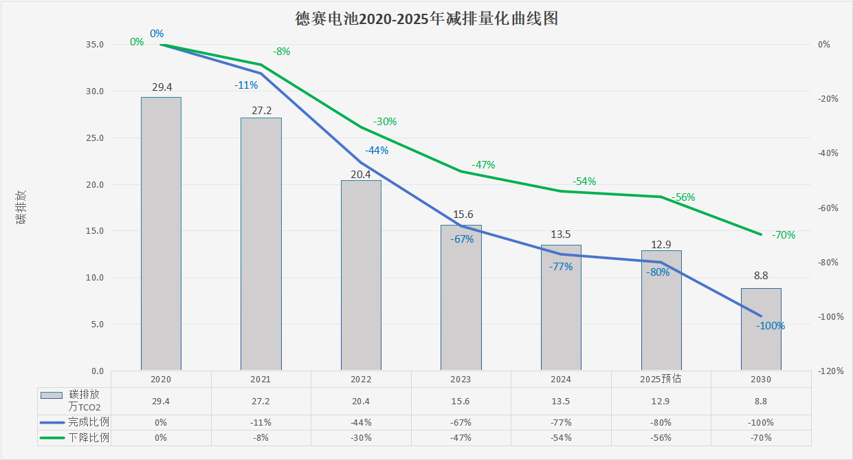 2022年德賽電池(惠南工業(yè)園)的范圍1、2、3碳排放總量約為11.3萬(wàn)噸,德賽電池通過(guò)不懈努力,僅至2024年,公司已成功將碳排放總量削減至約5.0萬(wàn)噸(已完成80%的目標(biāo)),實(shí)現(xiàn)相對(duì)于基準(zhǔn)年碳排放總量56%的顯著減排,2025年預(yù)計(jì)碳排總量約為4.7萬(wàn)噸(預(yù)計(jì)完成83%的目標(biāo)),實(shí)現(xiàn)相對(duì)