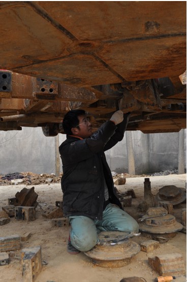 在地下1.4公里的掘進(jìn)路程,讓盾構(gòu)機(jī)從開(kāi)始的煥然一新到現(xiàn)在渾身都是泥土和銹跡,充滿了“奮斗”的痕跡,如同經(jīng)歷了一場(chǎng)大型戰(zhàn)役般,現(xiàn)在的盾構(gòu)機(jī)最需要的是休養(yǎng)和調(diào)整。據(jù)負(fù)責(zé)人李強(qiáng)介紹,盡管配備專(zhuān)門(mén)的維修保養(yǎng)人員,但在盾構(gòu)機(jī)掘進(jìn)過(guò)程中,仍會(huì)出現(xiàn)正常的使用損耗,如刀盤(pán)的泡沫孔被淤泥堵塞等,只能等到盾構(gòu)機(jī)完全拆卸后才能處理。現(xiàn)在他們的主要工作就是為盾構(gòu)機(jī)去泥、除渣、除銹、刷油,維修損壞部件,進(jìn)行例行保養(yǎng)。