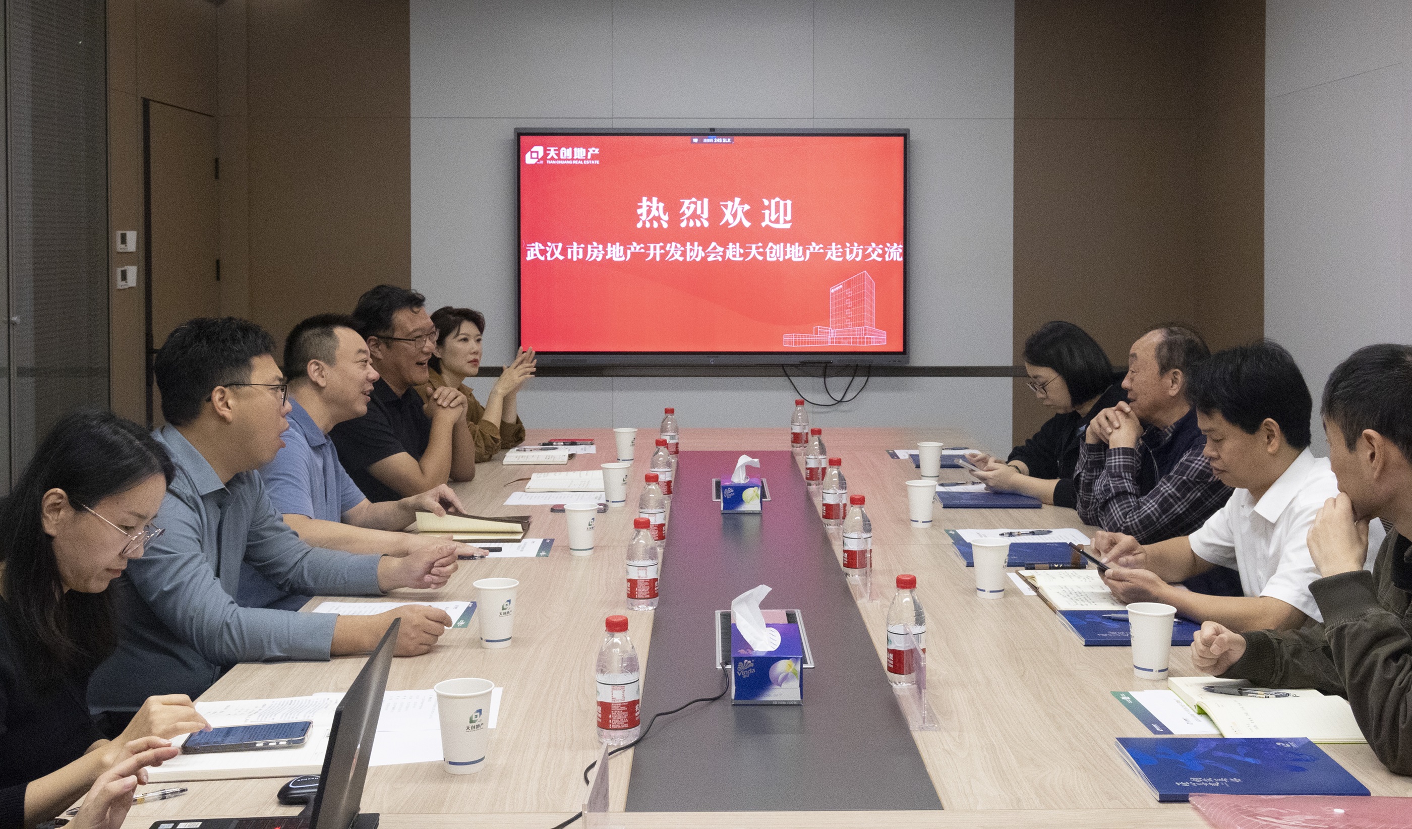 張漢培會長代表協會對天創地產當前的發展態勢和發展成果表示認可。他表示此次來訪,一是例行走訪,了解企業現狀,為年底協會換屆做好準備;二是聽取企業建議,為行業健康發展汲取經驗。隨后,雙方圍繞當前房地產市場宏觀政策及下一步工作開展方向進行了分享交流。