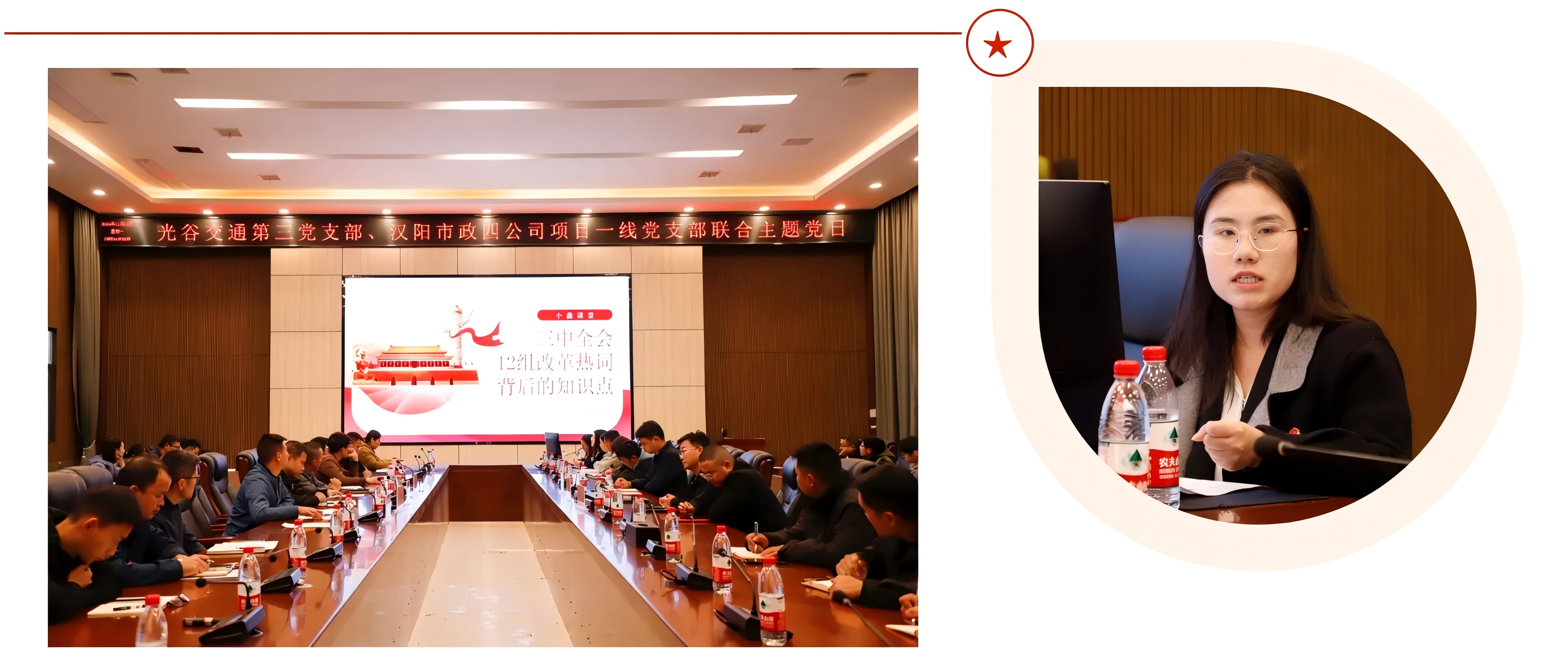 為深入學習貫徹習近平總書記關于全面深化改革的一系列新思想、新觀點、新論斷和黨的二十屆三中全會精神,傳達學習習近平總書記在湖北考察時的重要講話精神,凝聚思想共識,加強溝通交流,共謀合作發展,11月18日,漢陽市政鐘鑫建設項目一線黨支部與光谷交通第三黨支部聯合開展“凝心聚力共促發展,深化改革再創新章”主題黨日活動。